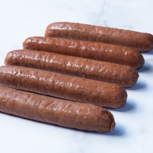Beef hot dogs with edible hog (pork) casing.